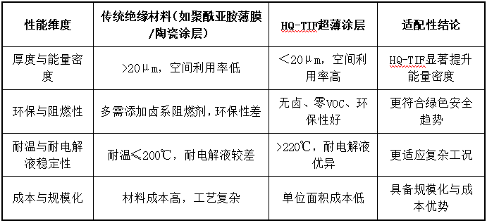 HQ-TIF技術(shù)的價(jià)值定位與未來(lái)展望HQ-TIF超薄阻燃絕緣涂層技術(shù),憑借其“超薄化、高性能化、綠色安全化”的三重優(yōu)勢(shì),成功突破了傳統(tǒng)絕緣材料在厚度、環(huán)保、阻燃、電性能等方面的瓶頸。其綜合性能高度契合新能源電池對(duì)高能量密度、高安全性和長(zhǎng)壽命的核心需求。未來(lái),隨著HQ-TIF在長(zhǎng)期可靠性驗(yàn)證、工藝適配性優(yōu)化和成本控制方面的持續(xù)突破,有望成為新能源電池絕緣材料的主流解決方案,為動(dòng)力電池與儲(chǔ)能電池的技術(shù)升級(jí)提供強(qiáng)力支撐。HQ-TIF不僅是一次材料性能的躍升,更是一條從“功能滿足”走向“性能躍升”的關(guān)鍵創(chuàng)新路徑。