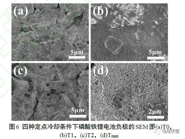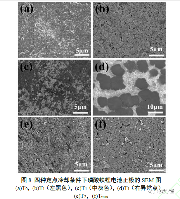 圖8顯示了四種定點(diǎn)冷卻條件下磷酸鐵鋰電池正極的SEM圖。電池開始自發(fā)熱時(shí),電池正極表面可觀察到活性材料顆粒,且表面覆蓋沉積物,推測來自于電解液分解產(chǎn)物。