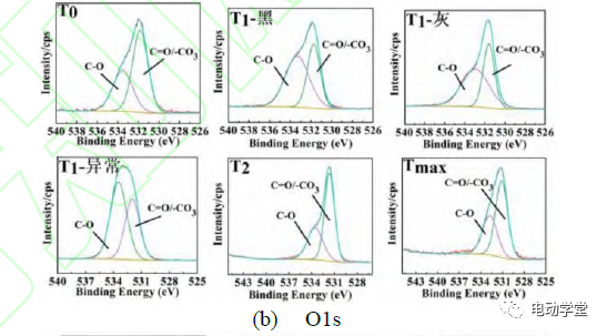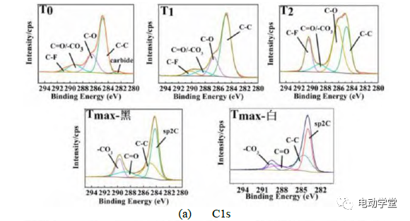在Tmax狀態(tài)下,正極表面主要存在較厚的界面膜、石墨化的C-C、-CO3、C-F等物質(zhì)。由此可知,磷酸鐵鋰正極和負(fù)極均在T0狀態(tài)下疑似已經(jīng)發(fā)生了副反應(yīng),但相比于負(fù)極材料,正極材料在熱失控狀態(tài)下安全性更加穩(wěn)定,這也和磷酸鐵鋰材料本身特性有關(guān)。