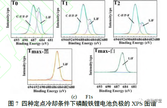 圖7(c)為四種定點(diǎn)冷卻條件下磷酸鐵鋰電池負(fù)極的F1sXPS圖譜。在溫度達(dá)到T0時(shí),負(fù)極表面的F存在C-F、F-P、LiF三種形式,其中,C-F代表著含氟有機(jī)物的生成;F-P代表殘留電解質(zhì)鹽LiPF6的存在以及相應(yīng)分解產(chǎn)物PFx的存在。