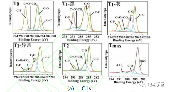 從圖7(a)可知,在自發(fā)熱溫度點(diǎn)T0狀態(tài)下,負(fù)極表面的C存在C-F、C=O、-CO3、C-O、C-C、及其他碳化物形態(tài),其中,C-C是導(dǎo)電劑SP的特征峰;C-F表明負(fù)極表面存在含氟有機(jī)物;C-O代表著PEO低聚物的生成;C=O代表ROCO2Li、Li2CO3等烷基鋰碳酸鹽的存在。由此可見負(fù)極表面除了導(dǎo)電劑外基本檢測到的都是SEI膜組成物質(zhì)。