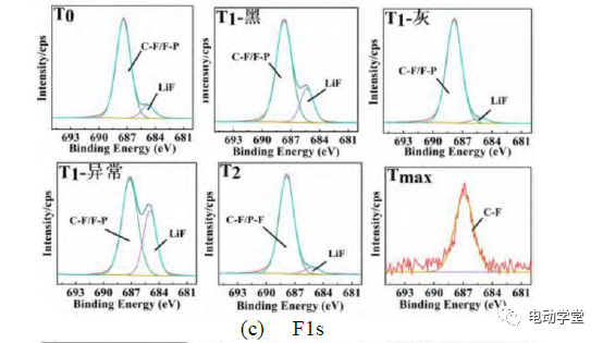 在溫度升高的過程中,C-F、P-F的占比先升后降,到Tmax時(shí),僅剩下LiF。隨著溫度的升高,LiPF6受熱分解或與其他物質(zhì)反應(yīng),先生成氟磷化物以及含氟有機(jī)物,電池?zé)崾Э睾?,這些氟磷化物以及含氟有機(jī)物因高溫全部轉(zhuǎn)化成了最穩(wěn)定的產(chǎn)物L(fēng)iF。