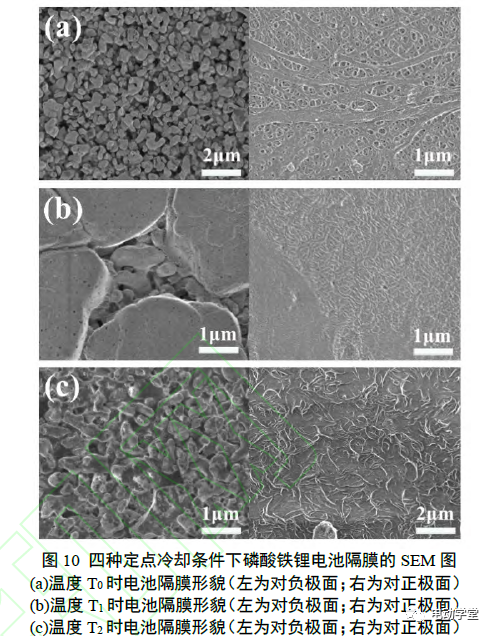 5)對(duì)于磷酸鐵鋰電池而言,當(dāng)溫度處于T0點(diǎn)時(shí),正負(fù)極均已開始發(fā)生副反應(yīng);當(dāng)溫度達(dá)到T1點(diǎn)時(shí),負(fù)極SEI膜破壞發(fā)生明顯副反應(yīng),正極界面膜增厚,隔膜閉孔且有明顯異物;當(dāng)溫度達(dá)到T2點(diǎn)時(shí),負(fù)極開始內(nèi)短路,正極界面膜增厚且表面發(fā)生碳化,安全閥開啟,電解液和氣體噴出,隔膜熔斷;當(dāng)溫度達(dá)到Tmax時(shí),隔膜已完全破壞,正、負(fù)極粉末大面積脫落。