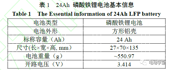 本次實(shí)驗(yàn)用電池為XX儲(chǔ)能電站中拆卸下來的24Ah磷酸鐵鋰的電池。電池基本信息如表1所示。