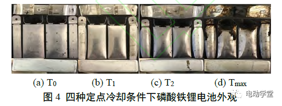 圖4顯示了四種定點(diǎn)冷卻條件下磷酸鐵鋰電池的外觀。可以發(fā)現(xiàn),隨著熱失控過程的進(jìn)行,磷酸鐵鋰電池鼓脹程度逐漸加劇,電池?zé)崾Э亟Y(jié)束后盡管外包裝仍然存在,但有明顯燒蝕現(xiàn)象。電池泄壓閥打開后,大量電池燃燒產(chǎn)物附著在殼體外部。