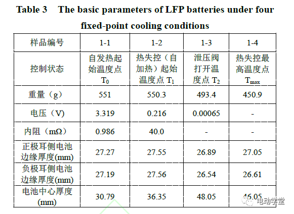 對(duì)比四種條件下的磷酸鐵鋰電池基本參數(shù),如表3所示??芍S著絕熱熱失控的進(jìn)行,電池重量逐漸降低,內(nèi)阻逐漸增加,中心厚度有明顯增長,開路電壓逐漸降低,且在達(dá)到熱失控溫度點(diǎn)后電池電壓急劇降低至0V。