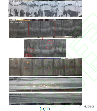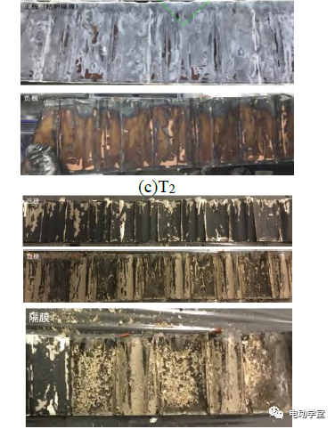 金色區(qū)域代表負(fù)極為嵌鋰態(tài),黑色區(qū)域的出現(xiàn)表明在T1狀態(tài)下電池發(fā)生內(nèi)短路,導(dǎo)致負(fù)極局部發(fā)生快速脫鋰。而分離出的隔膜雖然仍基本完整,但已存在一定程度的拉伸變形。表明在T1溫度下,隔膜發(fā)生一定程度的收縮,導(dǎo)致電池發(fā)生內(nèi)短路。